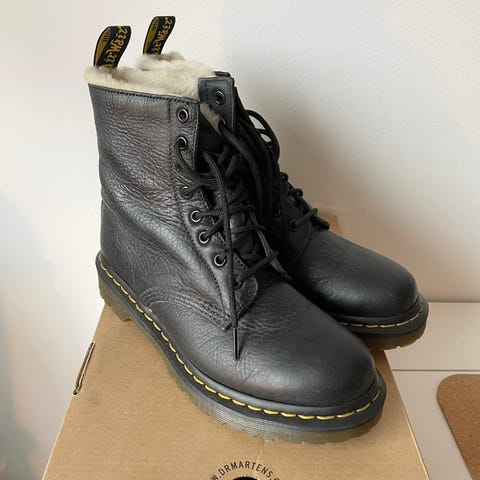 Dr. Martens stövlar i storlek 39 med svart färg. Skorna är av robust material och har en fodrad insida för extra värme. Modellen har snörning fram och en slitstark sula. Använda med synliga tecken på slitage.