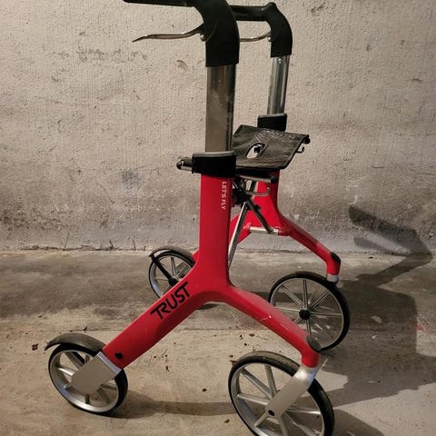 Dom är hel och fungerar bra förutom den röda rollatorn har en skada i ett handtag.