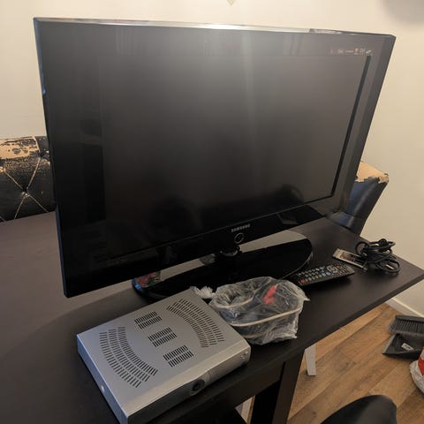 Äldre platt tv, oklart skick, säljes som den är. Har varit i förrådet i flera år. Av de första lcd skärmarna som kom ut.