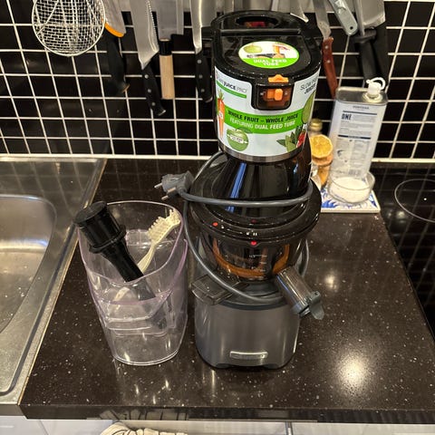 Maskinen har en robust design med flera delar inklusive en juicebehållare och en sil för frukt och grönsaker.