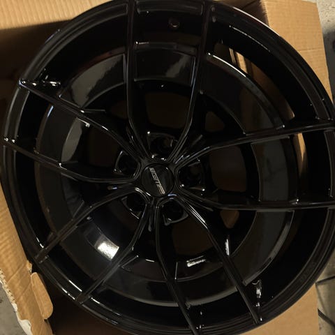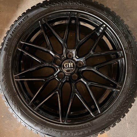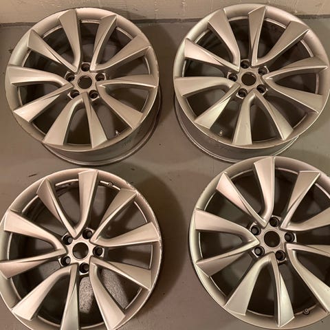 Kompletta däck med fälg som tidigare suttit på en Tesla Y.