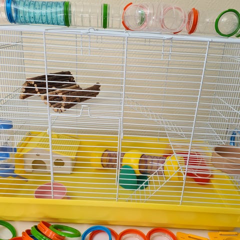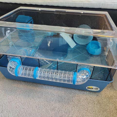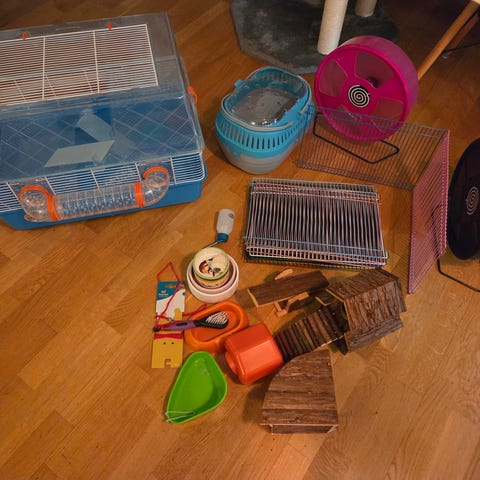 Bur 2: Har en spricka i plasten på locket, med det är inget som förstör funktionen. Den saknar dessutom en av ramperna, den upp till första våningsplanet. Vi löste det genom rör eller hus som hamstern kunde klättra upp på. Se bilder för vilka tillbehör som ingår. Pris: 350:-