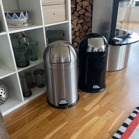 Vipp Papperskorg Pedalhink i beige färg. Tillverkad i metall med pedalmekanism för öppning. Designad för enkel användning och hygienisk hantering av avfall.