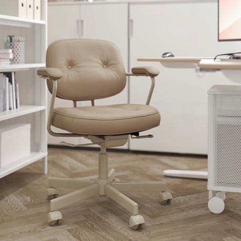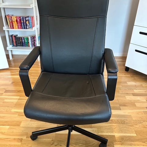 IKEA Alberto Meda kontorsstol i svart färg. Stolen har armstöd och hjul för enkel förflyttning. Designad för kontorsbruk med justerbar höjd och ergonomisk sittkomfort.