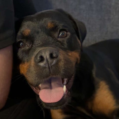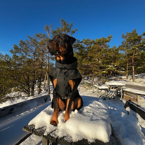 Vi har kommit fram till att vår Rottweiler hane på snart 3 år (blir 3 år i Maj) inte längre trivs med stadslivet. Vi flyttade från stort hus med gård till stan och nu efter att vi bott här i ett halvår så fungerar det inte riktigt, han behöver tillbaka till lugnet och naturen och ett mer aktivt liv. Han är en helt underbar hund, frisk och nyfiken. Han kan alla basic kommandon, sitt, ligg, tass, skall (stanna kan man behöva träna lite på om man har en godbit i handen). Han är en väldigt mat motiverad hund så det hjälper vid träning. Han går OK i koppel, kan behöva lite träning i och med att han växte upp med att springa lös. Han är uppvuxen med en tik hund och 5 barn, så han är både van med andra hundar hanar som tikar och barn (små och stora) men katter tror jag inte är passande. Det här är en VÄLDIGT stark hund på ca 50 Kg som dessutom behöver ha en fast hand och uppfostran för att förbli den hunden han är idag. Opie är en hund som gärna vallar barn och har en tendens att vilja vara med på all bus och lek och det är inte alltid en bra kombination med lägenhet och 5 barn. Vi ser gärna att han kommer till en familj/par/vuxen som har tid och viljan att fortsätta träna honom och aktivera honom på det sätt som vi kanske inte har haft, fullt ut. Hus och gård är inget måste men önskvärt dock inget som definierar en bra hundägare. Opie kan vara restriktiv mot nya personer men går snabbt över när han fått hälsa och vänja sig vid personen. Opie har haft turen att nästan aldrig behövt vara ensam, på både gott och ont kanske, så ensamträning kommer att behövas om man inte kan ta med han på jobb eller arbetar hemma etc. Han kommer att säljas ny vaccinerad och vi skickar med skålar/koppel/sele och en megastor bur. Skriv gärna vad du skulle kunna erbjuda Opie så hör vi av oss till dom som vi känner skulle kunna passa som ny familj för vår Opie.