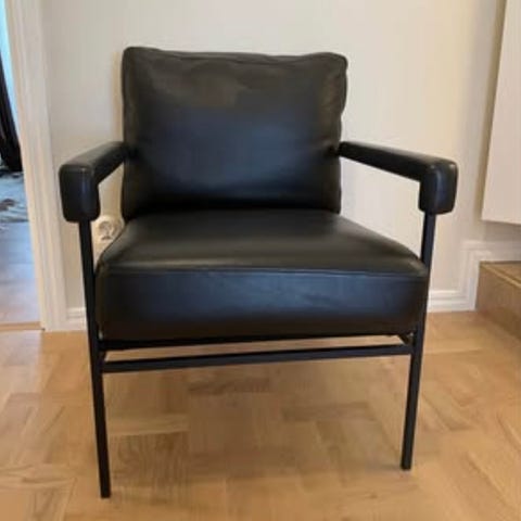 Justerbar fåtölj i rött låtsas skinn av Albin i Hyssna.