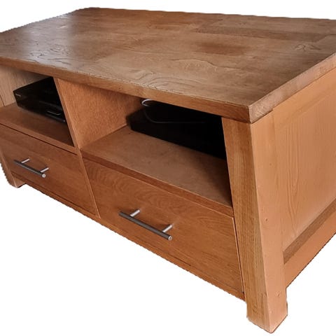 Robust tv-bänk i ek. Fint skick och ger praktisk förvaring. Något sliten på topplankan.