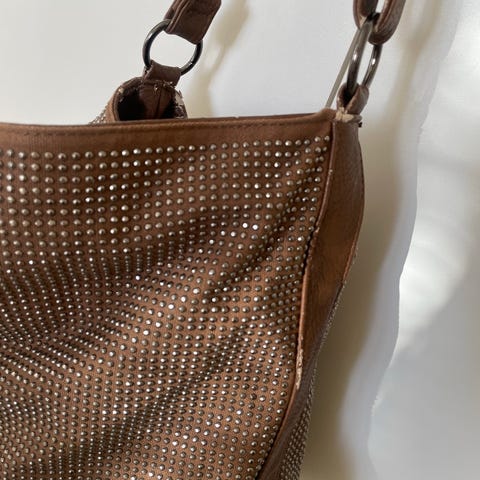 Väskan har en kombination av beige och ljus färg med ett justerbart axelband.