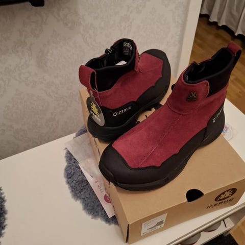 Icebug i vinröd mocca med ingällbara piggar-se bild. Anbända 2 ggr, passar ej min fot tyvärr.