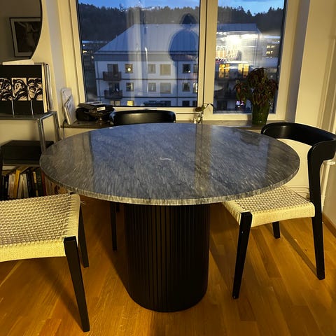 Marmormatbord med 4 stolar som ingår. Bordets höjd är 73 cm och diameter 100 cm. Stolarna och bordet har både en chromeguld accent på benen, om ni har några övriga frågor angående bordet/stolarna så är det bara att fråga.