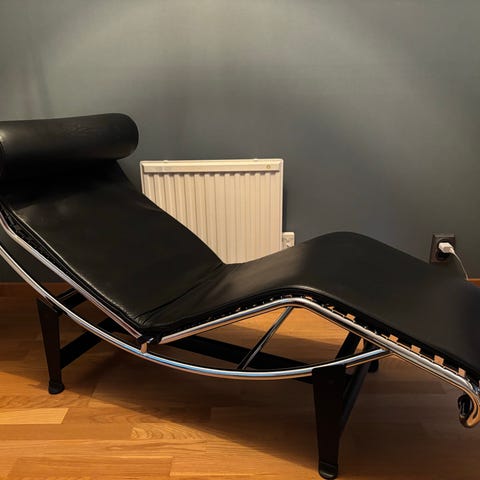 Le Corbusier LC4 vilstol, ursprungligen formgiven 1928, med stomme i krom och klädsel i svart skinn. Omärkt.