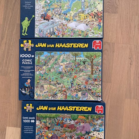 Jan Van Haasteren pussel till salu. De flesta är 1000 bitar, något enstaka med 1500 bitar samt tre stycken Wasgij? (två 1000 bitar och ett 500 bitar). Alla kostar 75kr/st och alla pussel är lagda två gånger, så nästan som nya. Vänligen uppge nummer på det pussel/de pussel du önskar köpa (syns på bilderna)