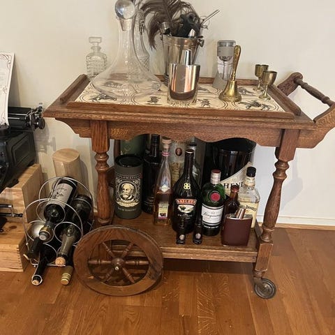 Vintage serveringsvagn i trä med hjul och kakelplatta