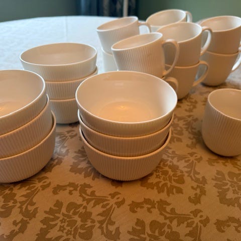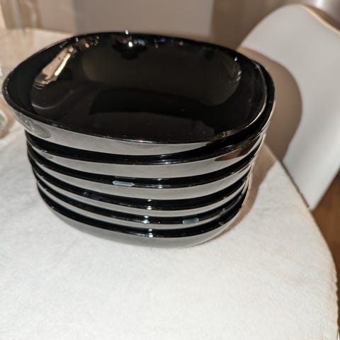 4 tallrikar, 4 djupa tallrikar, 4 assietter samt ett avlångt uppläggningsfat (färg skiljer sig lite, se bild)