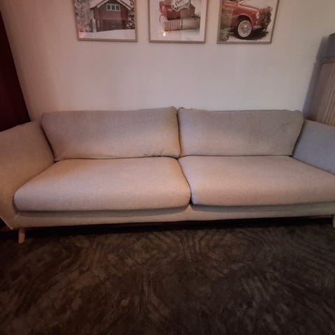 Soffan är tvättad grundligt med textiltvätt en gång om året, utöver det är kuddfodralen till rygg och sits tvättade 4 gånger om året.
