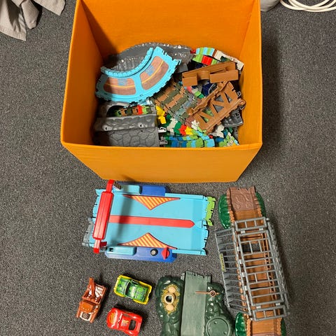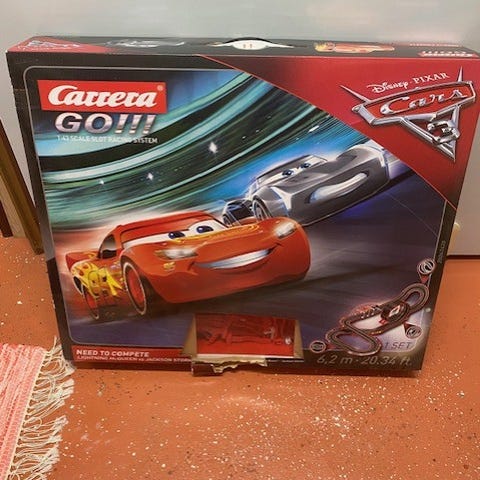 Alla delar som syns på kartongen finns med. Fungerande röd bil. Använd men mkt bra skick.