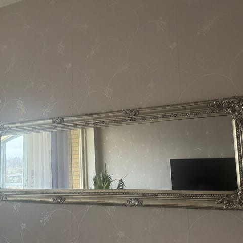 Spegel med guldram i storleken 135x75 cm. Spegeln har en rektangulär form och en trä guldfärgad ram. Passar för inomhusbruk som väggspegel.