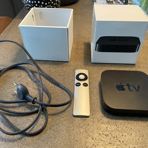 Apple Apple TV digital mediaspelare i svart färg. Enheten används för att strömma digitalt innehåll till en TV och levereras med fjärrkontroll och anslutningskablar.