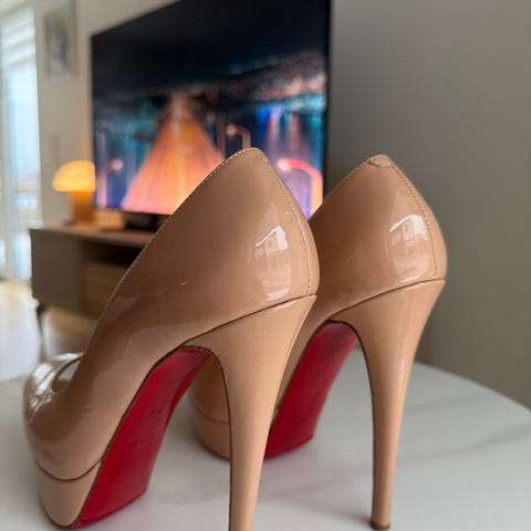 klackskor i storlek 38 med öppen tå och slingback-design. Skorna är svarta och har en hög klack samt en plattform fram. Materialet är lackat, vilket ger en blank yta.