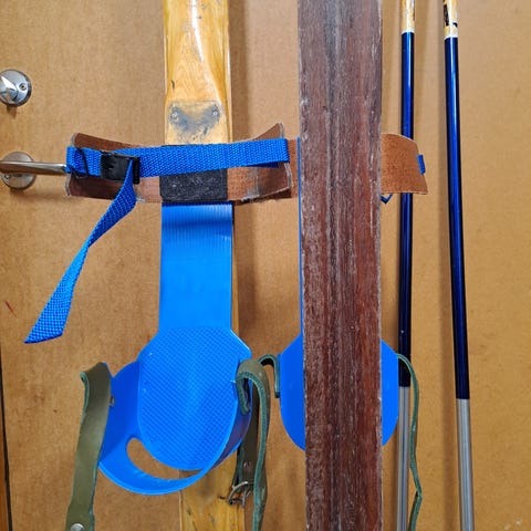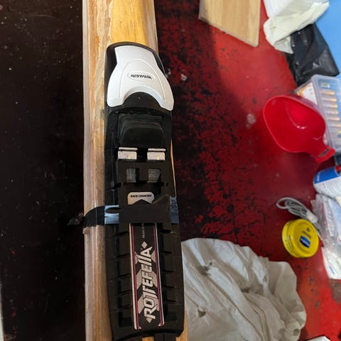 Tjärades in med riktig dalbränd svensk tjära i höstas (syns ej på bild, tagen innan dess) så det är bara att åka. Läderremmarna på bindningarna är nästan nya och i väldigt fint skick. Följer med extraremmar.