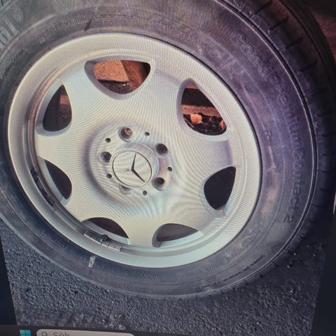 Sommar däck som suttit på en Mercedes C-klass. Däck slitna men fungerar en säsong till. Skada på en av fälgarna se bild.