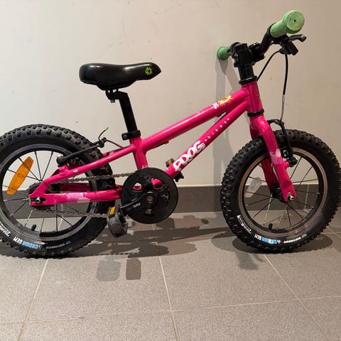 Stoy barncykel med 14" hjulstorlek i vacker grön färg. Knappt använd. Mycket sparsamt använd och har förvarats i garage.
