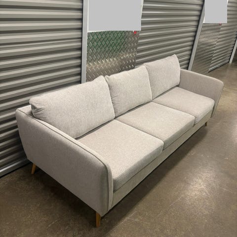 Mio Alex Stone soffa med en bredd på 211 cm i grått tyg. Soffans kuddar och dynor har avtagbara klädslar som kan tvättas. Sitthöjd är 48 cm, djup 95 cm, höjd 88 cm, vikt 49 kg, sittbredd 90 cm och sittdjup 58 cm.