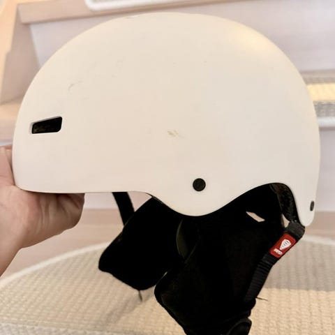 Rossignol 529 Ski hjälm i storlek S/M, färg vit med röda och svarta detaljer. Hjälmen har ventilationsöppningar och justerbart spänne. Designad för skidåkning och ger skydd för huvudet vid vinteraktiviteter.