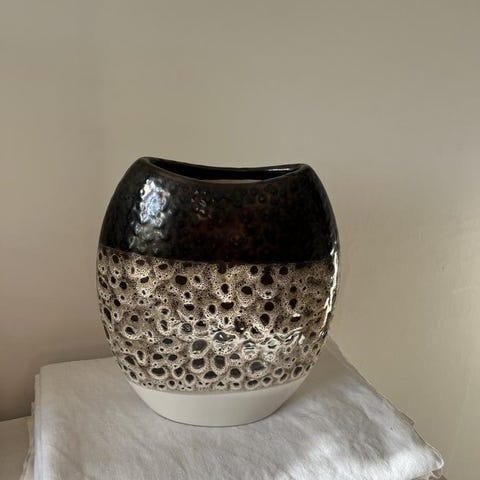 Vas i keramik med blommönster. Stämplad Arabia, signerat ET (Esteri Tomula). Höjd 20 cm, diameter nertill 5 cm.