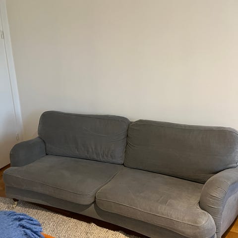 Lättplacerad tvåsitssoffa Howardmodell. Ljusgrått tyg. Ben i ek. Benen fram svarvade med mässingshjul