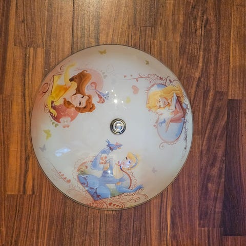 Disney Prinsessor taklampa i rosa färg med motiv av olika prinsessor. Lampan är designad för att hängas i taket och passar bra i barnrum. Den har dekorativa detaljer runt kanten och avger ett mjukt ljus.