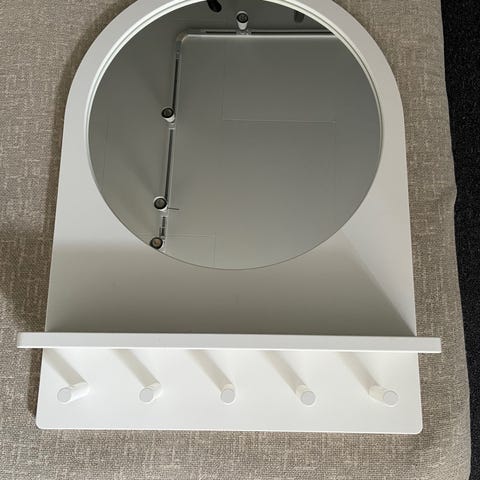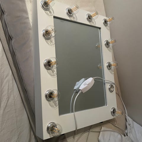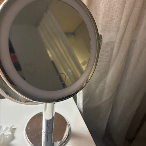 Spegel som är perfekt för att sminka sig eller bara bara njuta av sin spegelbild! Som syns på bilden saknas en glödlampa med det går lätt att köpa till på till exempel Ikea eller Clas Olsson. Anars är skicket utmärkt utan fläclar eller liknande. Lampan är 60×60 cm stor. Notera att de andra sakerna på bilden inte ingår.