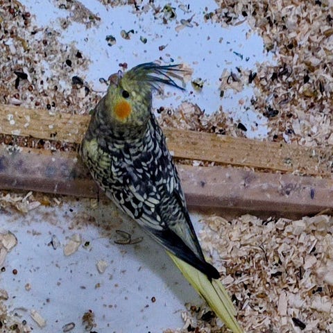 Jag har för många Nymfparakiter. Här en av dom. Flyger fritt , återvänder till buren. är inte tam men äter ur handen. 6 Månader gammal Kön hona.