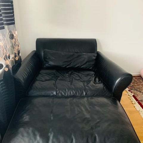 Soffa och vitt bord med hjul.