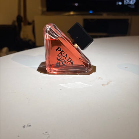 Prada Paradoxe Eau de Parfum 90 ml i en glasflaska med svart lock. Produkten levereras i en rosa förpackning. Parfymen har en ljus bärnstensfärgad vätska.