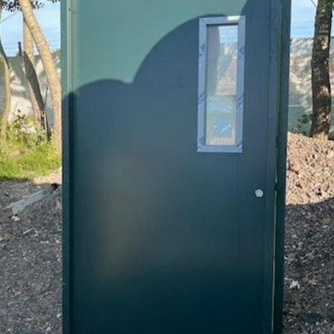 Navaliber A-60 branddörr i ljusgrå färg tillverkad i stål. Dörren är brandskyddad och mycket tung och avsedd för att användas som branddörr i fartyg eller byggnader. Lasthjälp finns.