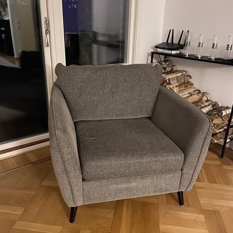 Skön och bekväm fåtölj från Mio. Modell "Cordelia" och tyg "Darin light grey"