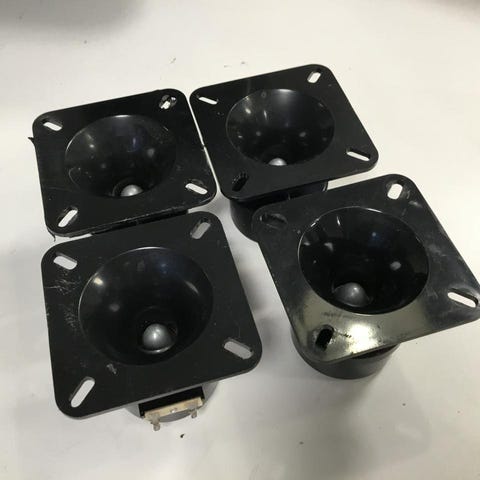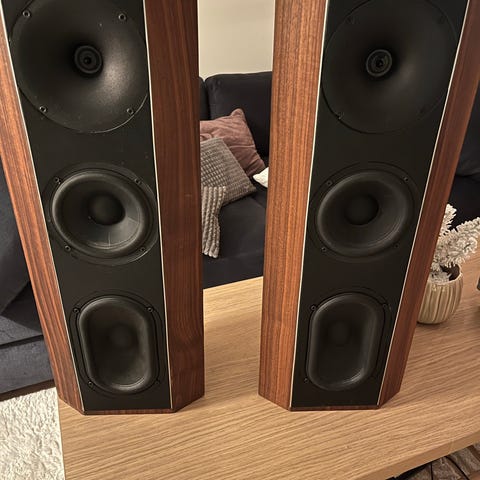 Ett par Svenska Octab 150 MK3. Dessa var från början ett par kvartvågshorn med dubbla 6,5" basar och en softdome tweeter. Dom är numera ombyggda till en basreflexlåda med en ny 8" Pearless bas,en ny 6,5" Vifa mellanregister, en ny vifa dometweeter samt ett nytt trevägsfilter. Detta gör att dessa spelar betydligt bättre!. Mycket fina i svartbetsad äkta faner. B=33,5 cm. H=73 cm. D=28,5 cm. 16 kg/st 1200:-