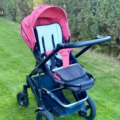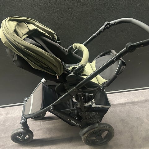 Inköpt 2023, använd av ett barn. Kvitto finns. Mycket fint skick, endast lite märken längst fram på chassit. Regnskydd ingår.