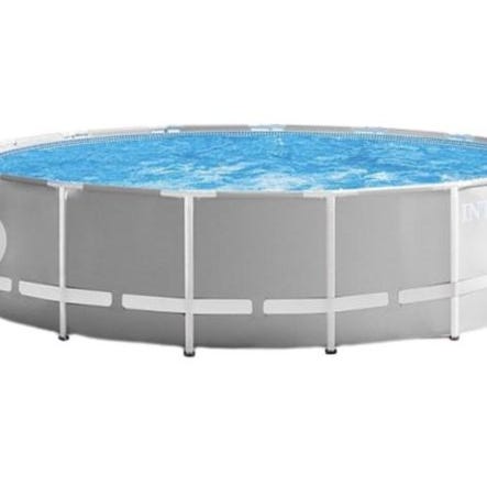 Intex rund pool med en diameter på 244-732 cm (24 fot). Poolen är av modellen 8' - 24' och tillverkad för utomhusbruk. Produkten omfattar delar för montering och underhåll, inklusive slangar och kopplingar.