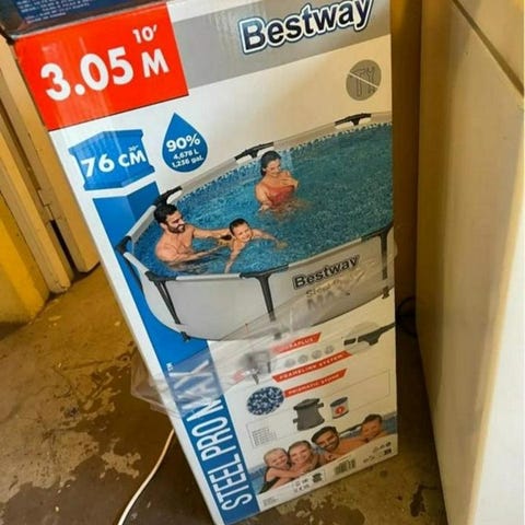 Poolen har använts av tidigare husägare och har legat ner packad i källaren sedan vi köpte huset. Enligt föregående ägare så skall alla delar finnas i källaren och den fungerade utan problem senast dem använde den enligt utsago. Hittar inget som visar på exakt mått utöver instruktionshäftet så kan vara från 244cm till 732cm stor det lär märkas när man monterar upp den.