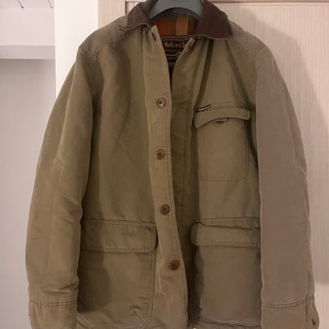 Vintage Marlboro brun jacka i bomull för herrar i storlek M. Jackan har flera fickor och en knappstängning framtill. Designen inkluderar en kontrasterande krage i mörkare nyans. Passar för vardagligt bruk och utomhusaktiviteter.