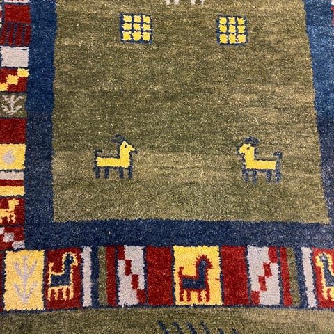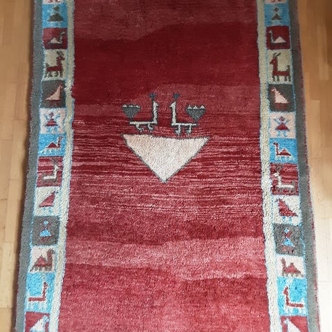 Handknuten Gabbeh-matta från Indien. Kommer från ett barn-, djur- och rökfritt hem. Förvarad undanstoppad under lång tid, bra skick. Aningen "bananformad", se bild.