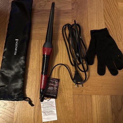 Krustång röd och svart handtag och flera värmeinställningar. Utrustad med strömkabel och justerbar temperaturkontroll.