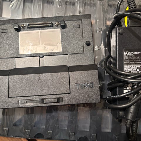 Dell E-Port Plus dockningsstation med flera anslutningsmöjligheter inklusive parallellport, seriellport och VGA-port. Enheten är kompatibel med Dell-laptops och erbjuder anslutning för externa bildskärmar och kringutrustning.