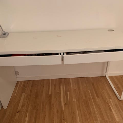Vitt klassiskt skrivbord från ikea, kommer med hurtsen med 6 lådor. Finns att hämta på Rackarbergsgatan.