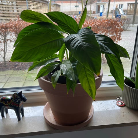 Fredskalla växt placerad i en vit kruka. Växten har gröna blad och är lämplig för inomhusmiljöer.