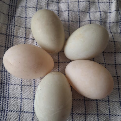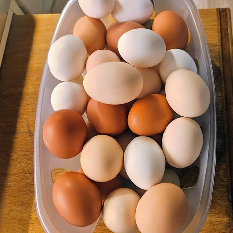 Avelsägg med god befruktningsgrad från trevlig & produktiv blandras, varav hönsen har anlag för spektrumet av äggfärg som synes i bild och väger ungefär 60 g. Provkläck har givit friska kycklingar. Hönsen blir ungefär 2 kg tunga, tuppen något tyngre. Welsumer, Brahma och Maran är de raser jag har vetskap om. Bild 2 och 3 visar gruppen som äggen härstammar ifrån.