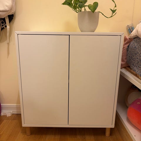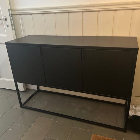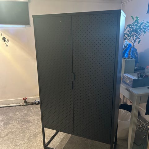 Säljer en fin förvaring från möbelmärket Svenheim. Modell på denna är vad jag vet ”Titan” 2A4 med låsandes skjutdörrar och svart golvstativ i metall.