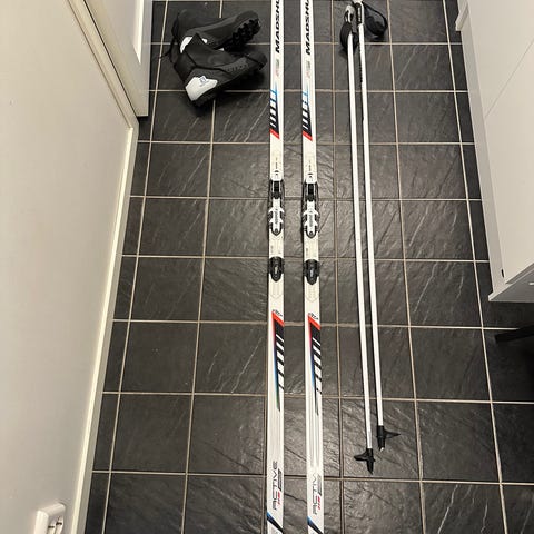 Hybrid mellan längdskidor och turskidor, vallningsfria med fiskfjäll, bra glid och manövrering. Som nya, bara använda 3 gånger. 1700kr